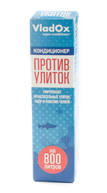 Кондиционер VladOx ПРОТИВ УЛИТОК предназначен для выведения из аквариума улиток, гидр, червей и пиявок в пресноводных аквариумах.