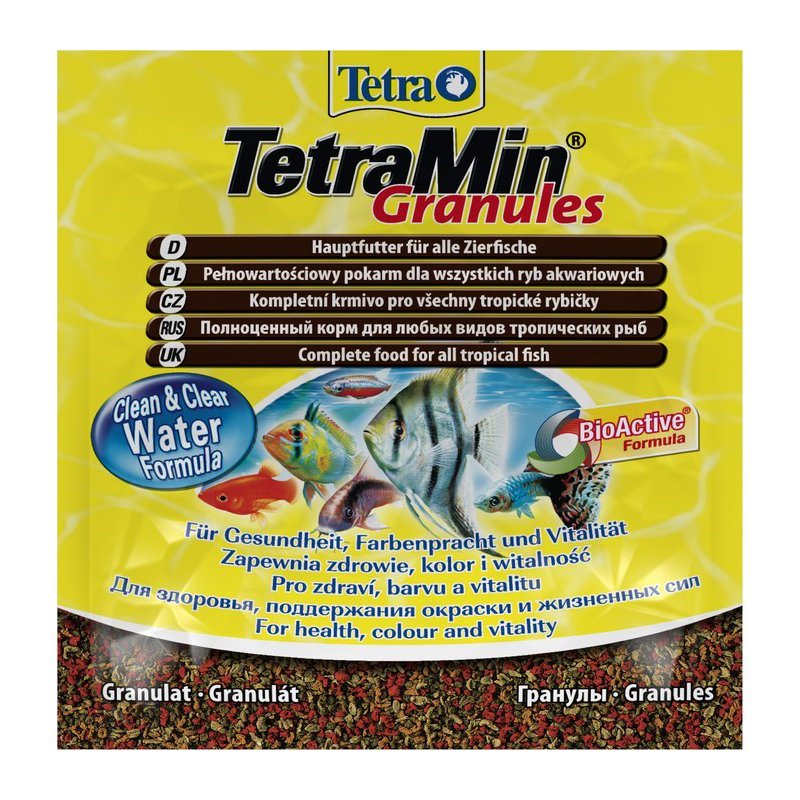 TetraMin Granulat – Гранулированный корм для всех видов декоративных рыбок.небольшие гранулы корма, содержащиеся в практичной упаковке, быстро размягчаются в водегранулы медленно опускаются на дно аквариума, что гарантирует полноценное и разнообразное питаниесодержит такие жизненно важные вещества как протеины, витамины, лецитин, а также добавку, обеспечивающую рыбкам насыщенность окраски. За счет этих элементов достигается здоровый рост, богатство красок, и жизненная силас запатентованной* формулой BioActive- для продолжительной и здоровой жизни Ваших питомцевоптимальная степень усвоения всеми видами рыб