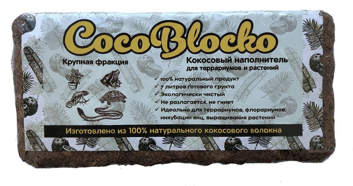 - Экологически чистый природный материал;- Идеально для террариумов, флорариумов, горшечных и садовых растений;- Можно использовать в инкубаторах;- Прекрасно удерживает влагу;- Не разлагается, не гниет;- Рекомендуется замена один раз в месяц.Прессованный кокосовый субстрат залить холодной или теплой водой и подождать увеличения объёма.Объем при размачивании от 8 до 9 литров.Этот экологичный субстрат помимо декоративной функции играет важную роль в создании и поддержании влажности воздуха в террариуме и совершенно безопасен для террариумных животных.Естественное обеззараживающее воздействие материала предупреждает распространение плесени в донном грунте.Этот субстрат так же можно использовать как питательный грунт для живых растений в террариуме или флорариуме.Кокосовый субстрат может также применяться для инкубации яиц благодаря своим гигроскопичным свойствам.Масса нетто 500грМатериал: кокосовое волокно.
