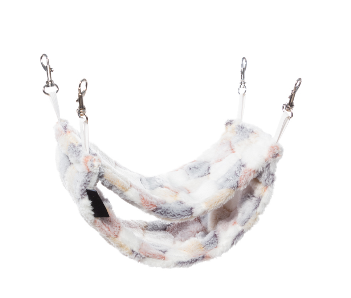 Двухъярусный гамак "Шалаш" для мелких животных обязательно понравится вашему питомцу. Выполнен из мягкого плюшевого материала. Легко подвешивается в клетке при помощи карабинов.
