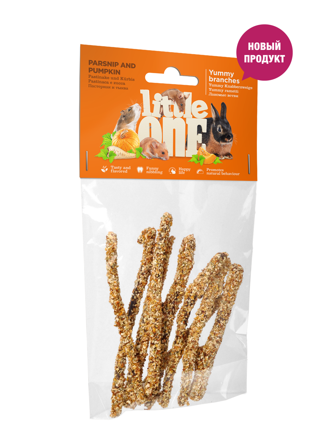 Лакомые ветви с пастернаком и тыквой – это любимое лакомство питомцев, которое прекрасно подходит для разнообразия их рациона. Ветви в обсыпке из пастернака и тыквы являются ценным источником витаминов С и группы В, каротина и эфирных масел. Состав: плодовые ветви, сушеный пастернак, сушеная тыква, продукты растительного происхождения.