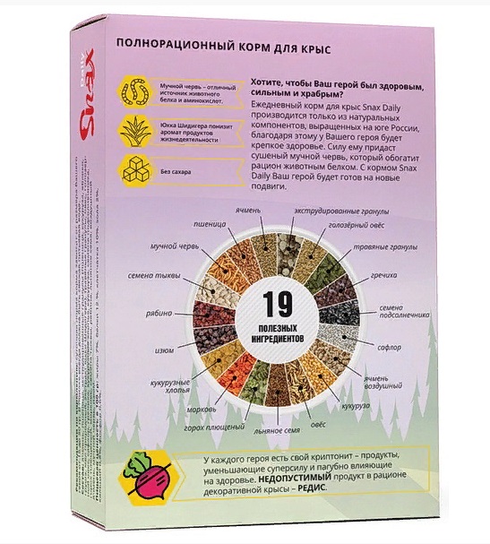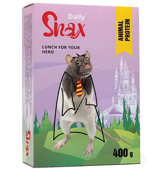 Хотите, чтобы Ваш герой был здоровым, сильным и храбрым? Ежедневный корм для крыс Snax Daily производится только из натуральных компонентов, выращенных на юге России, благодаря этому у Вашего героя будет крепкое здоровье. Силу ему придаст сушеный мучной червь, который обогатит рацион животным белком. С кормом Snax Daily Ваш герой будет готов на новые подвиги.