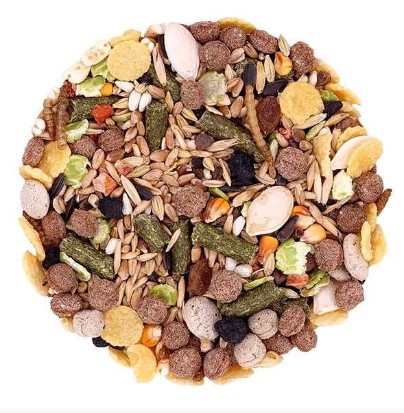 Состав: Ячмень, пшеница, экструдированная гранула (пшеница, кукуруза, яблоко, груша, мел природный, экстракт юкки Шидигера), травяные гранулы, овес, голозерный овес, сафлор, гречиха, кукурузные хлопья, кукуруза, семена подсолнечника, горох плющеный, морковь, семена тыквы, рябина, льняное семя, воздушный ячмень, мучной червь, изюм.