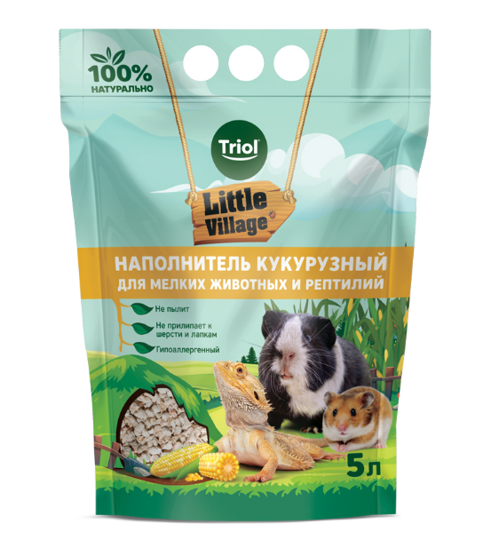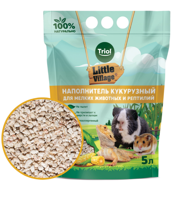 Впитывающий наполнитель TRIOL LITTLE VILLAGE изготовлен из высушенных и измельченных стержней кукурузных початков без добавления красителей и ароматизаторов. Воздушные гранулы отлично впитывают влагу и эффективно поглощают запахи. Кукурузный наполнитель не содержит пыли и гипоаллергенен. Органические материалы в составе наполнителя распадаются естественным путем и не наносят вред окружающей среде. Кукурузный наполнитель подходит для содержания грызунов (хомяков, мышей, крыс, морских свинок), кроликов, террариумных животных (змей, ящериц, черепах). Может использоваться вместо песка для птиц. Объем: 5л. Вес: 2кг.