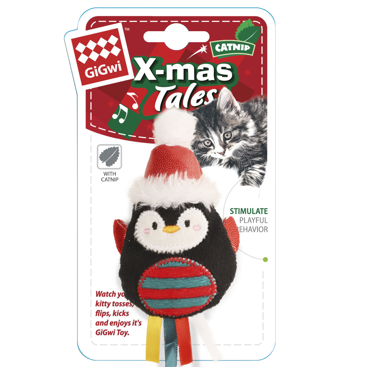 Игрушка для кошек "Пингвин с ленточками" изготовлена из высококачественного текстильного материала с набивкой и кошачьей мятой внутри.