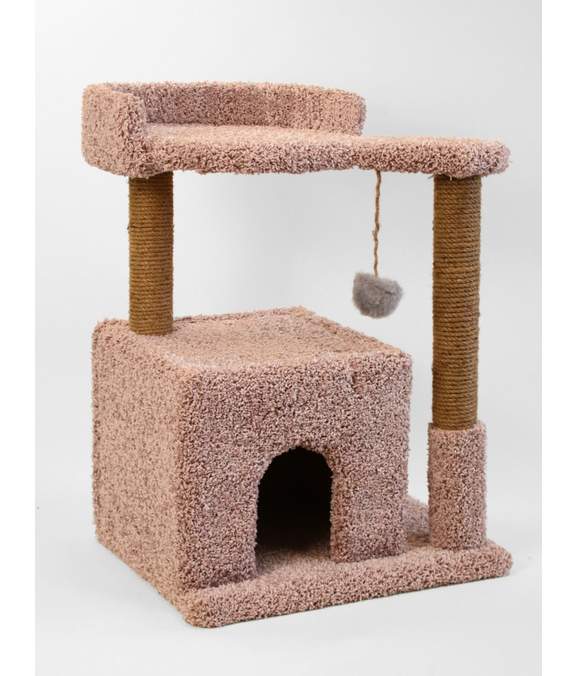Просторный домик отделанный ковролином с удобным входом подойдёт как для котят, так и для взрослых питомцев. Точить когти помогут два столбика, декорированные джутом или ковролином. На верхней полке удобно лежать, свернувшись клубком или вытянув лапы.