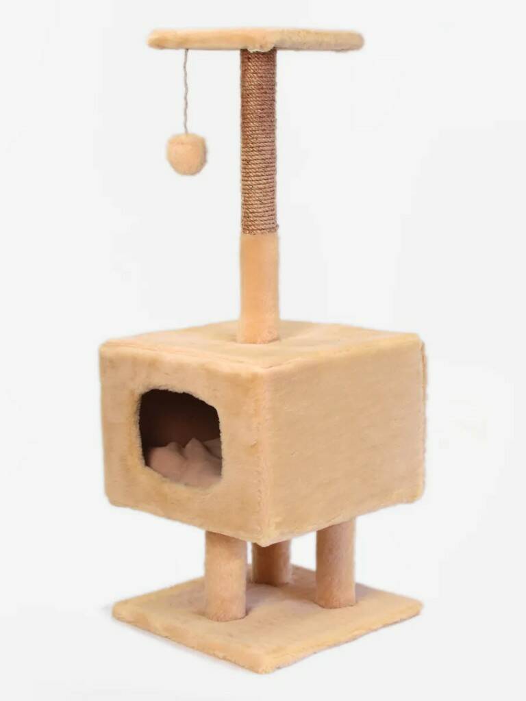 Простой домик-когтеточка квадратной формы на такой же подставке, с круглой полкой, на которой подвешен помпон. Изготовлен из ДСП и ДВП и оббит искусственным мехом.