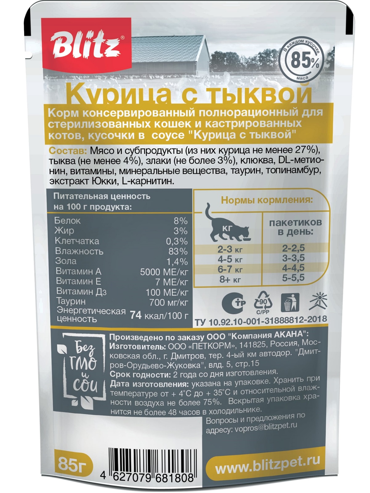 Корм Blitz Classic «Курица с тыквой» создан специально для кастрированных котов и стерилизованных кошек, чтобы поддерживать их здоровье и идеальный вес после операции.