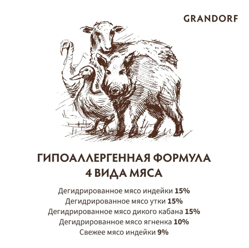 Состав: Дегидрированное мясо индейки (15%), Дегидрированное мясо утки (15%), Дегидрированное мясо дикого кабана (15%), Цельнозерновой коричневый рис, Дегидрированное мясо ягненка (10%), Свежее мясо индейки (9%), Жир индейки (4%), Льняное семя, Порошок корней цикория (натуральный источник пребиотиков: FOS и инулин), Пивные дрожжи (природный источник MOS и бета-глюканов), Свежее масло лосося (1%), Сушеный антарктический криль (натуральный источник ЭПК и ДГК, 1%), Растительная клетчатка, Сушеное яблоко, Сушеная клюква, юкка Мохаве.