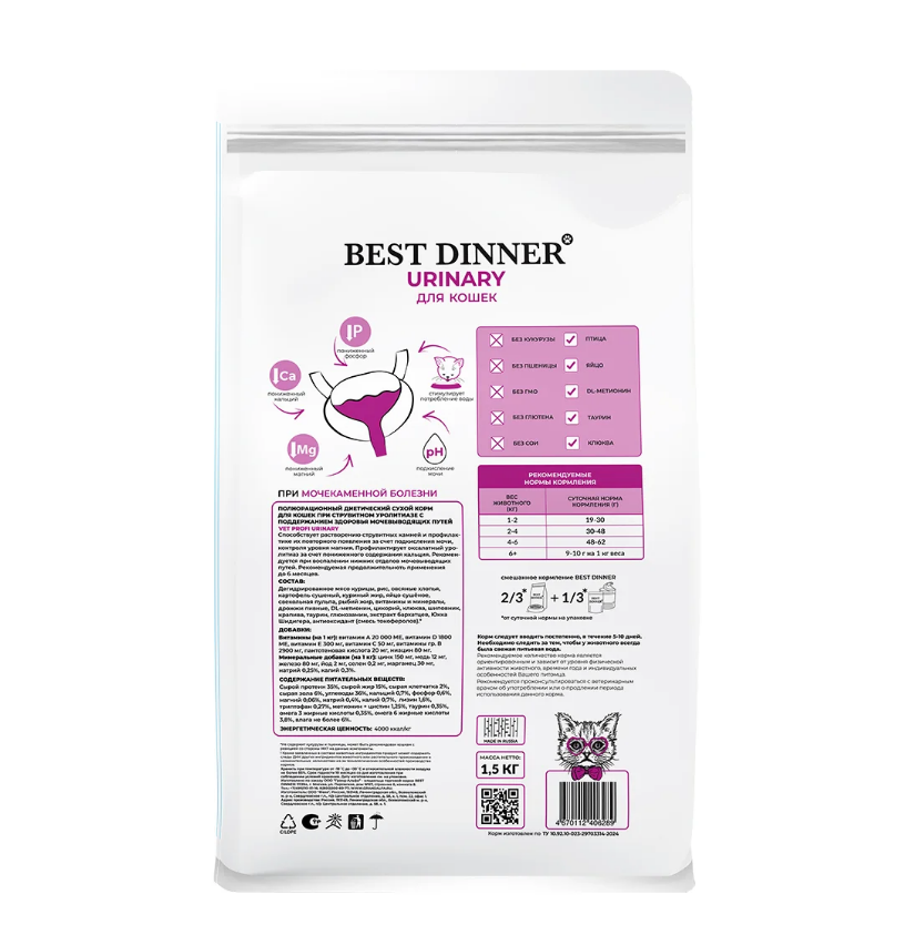 Способствует растворению струвитных камней и профилактике их повторного появления за счет подкисления мочи, контроля уровня магния. Профилактирует оксалатный уролитиаз за счет пониженного содержания кальция. Рекомендуется при воспалении нижних отделов мочевыводящих путей. Рекомендуемая продолжительноть применения до 6 месяцев. Рекомендуется проконслуьтироваться с ветеринарным врачом об употреблении или о продлении периода использования данного корма. Вода должна быть доступна кошке в любое время.