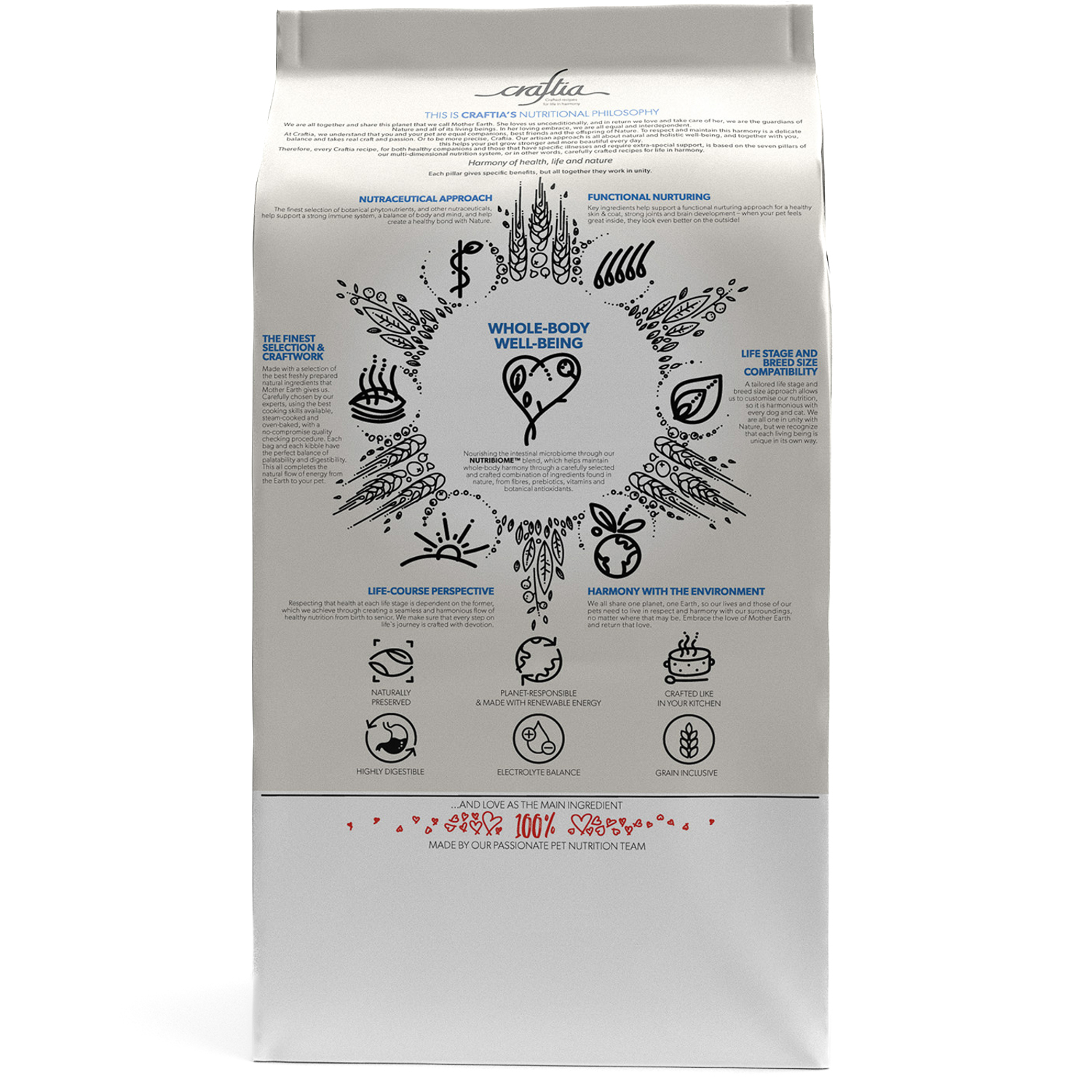 Состав: дегидратированный куриный белок*, рис*, картофель*, жир домашней птицы (курица, индейка)*, гидролизованные рыбные белки (минтай, пикша)*, дегидратированный белок лосося*, дегидратированный свиной белок*, сухое яйцо (куриное)*, ячмень*, овёс*, льняное семя, масло лосося (4%)*, сухая свекольная пульпа, клетчатка гороха, монокальцийфосфат, хлорид калия, инулин цикория (0,6%), дрожжевой экстракт (источник маннанoлигосахаридов) (0,6%), фруктоолигосахариды (0,4%), сухие пивные дрожжи, карбонат кальция, хлорид натрия, аскофиллум узловатый (Ascophyllum Nodosum).