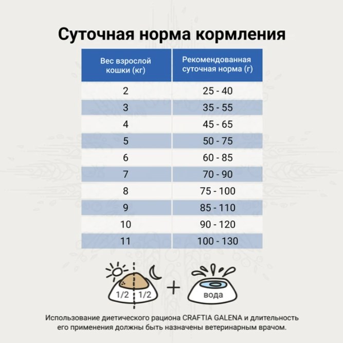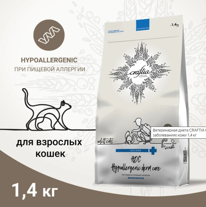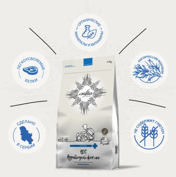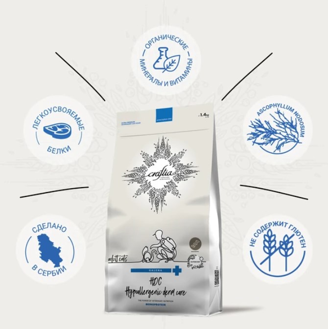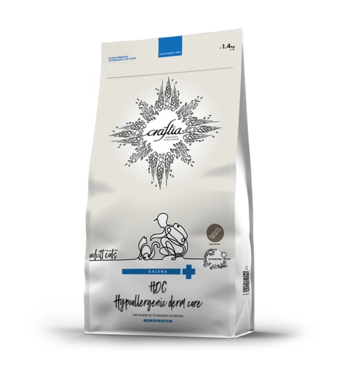 Craftia Galena Hypoallergenic Derm Сare - полнорационный диетический гипоаллергенный корм для кошек, разработан при дерматологических заболеваниях и избыточном выпадении шерсти.
