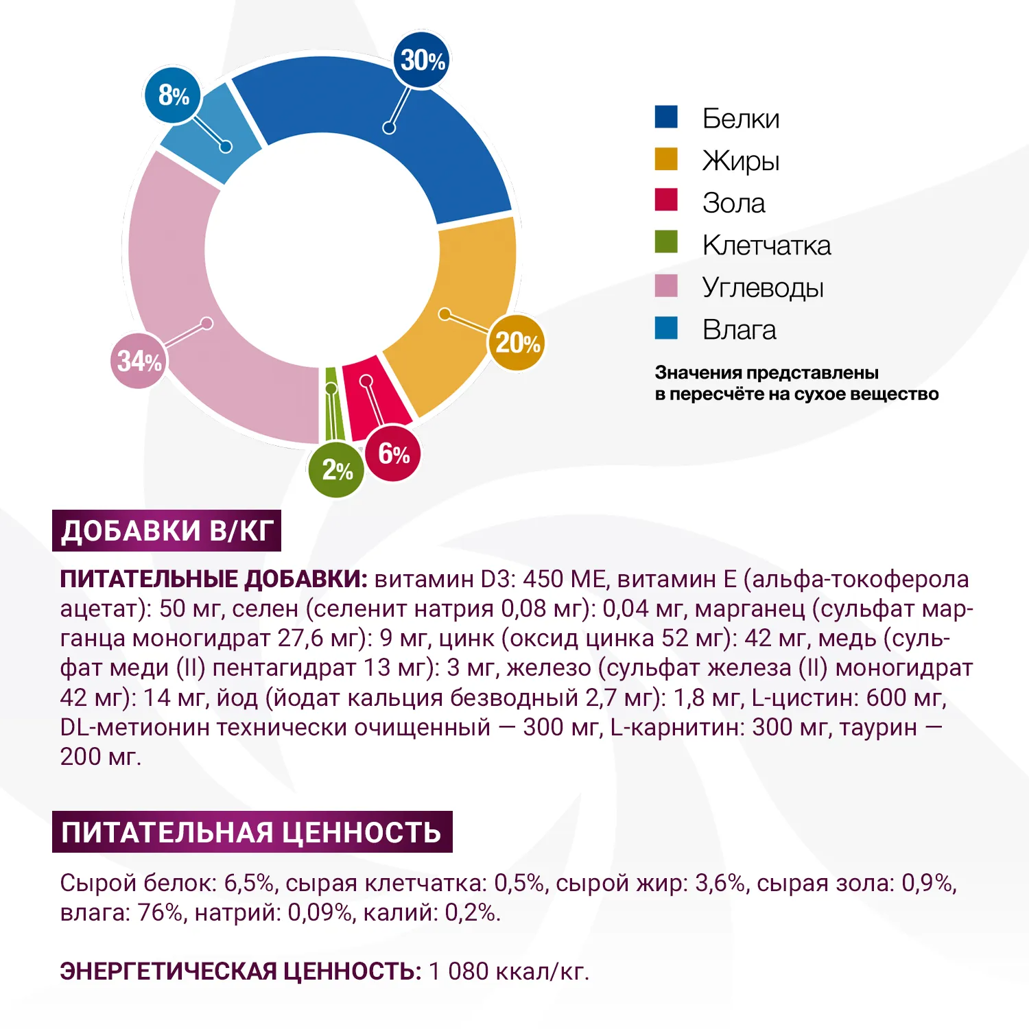 Питательные добавки на кг: витамин D3: 225 МЕ, витамин Е (альфа-токоферола ацетат): 50 мг, селен (селенит натрия 0,04 мг): 0,02 мг, марганец (сульфат марганца моногидрат 13 мг): 4.3 мг, цинк (оксид цинка 26 мг): 21 мг, медь (сульфат меди (II) пентагидрат 6.7 мг): 1.7 мг, железо (сульфат железа (II) моногидрат 21 мг): 7 мг, йод (йодат кальция безводный 1.8 мг): 0.9 мг, L-цистин: 600 мг, DL-метионин технически чистый 300 мг, L-карнитин: 300 мг, таурин 200 мг.