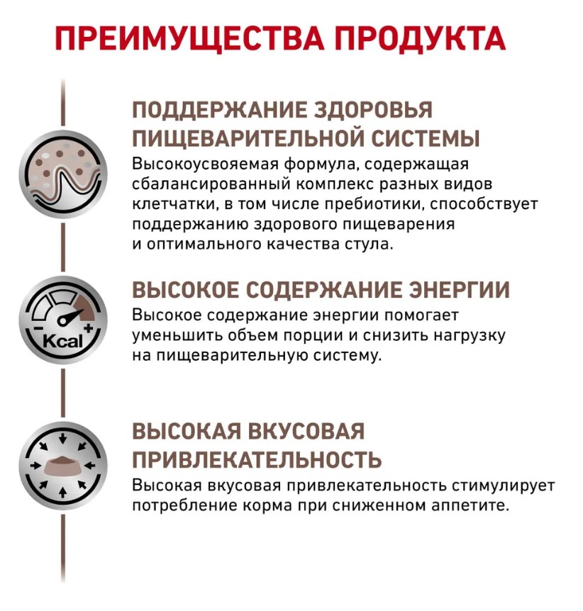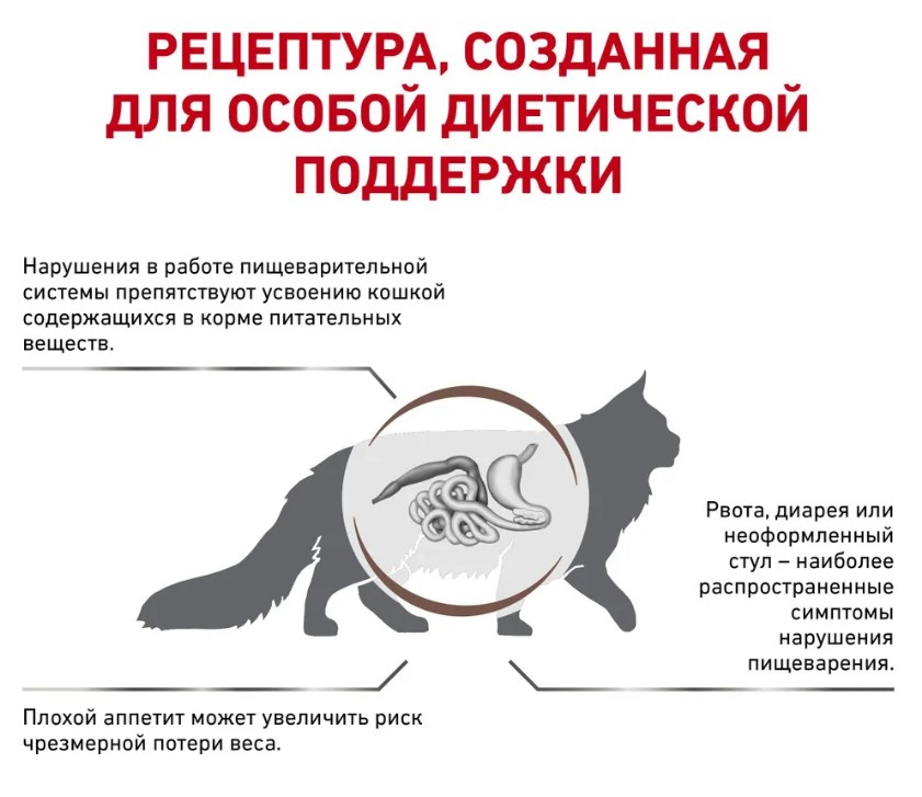 Сухой корм ROYAL CANIN® GASTROINTESTINAL (ГАСТРОИНТЕСТИНАЛ) – полнорационный диетический корм для кошек, рекомендуемый при острых расстройствах пищеварения, в реабилитационный период и при истощении. Легкоусвояемые ингредиенты. Дополнительное количество электролитов и высокое содержание основных питательных веществ. Высокая калорийность.