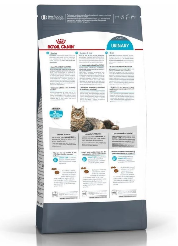 Корм сухой полнорационный для кошек - Специально для взрослых кошек в возрасте старше 1 года URINARY CARE (УРИНАРИ КЭА) ROYAL CANIN®, подходящий для взрослых кошек в возрасте старше 1 года, обеспечивает профилактику образования мочевых каменей и снижение риска мочекаменной болезни. ИНГРЕДИЕНТЫ: изолят растительных белков*, злаки, мука из зерновых культур, дегидратированные белки животного происхождения, растительная клетчатка, животные жиры, гидролизат белков животного происхождения (вкусоароматические добавки), минеральные вещества, соевое масло, дрожжи и побочные продукты брожения, рыбий жир, аминокислоты, экстракт бархатцев прямостоячих (источник лютеина). ДОБАВКИ (в 1 кг): Питательные добавки: Витамин A: 14200 ME, Витамин D3: 740 ME, Железо: 34 мг, Йод: 3,4 мг, Медь: 11 мг, Марганец: 45 мг, Цинк: 134 мг, Ceлeн: 0,05 мг - Консерванты - Антиокислители. СОДЕРЖАНИЕ ПИТАТЕЛЬНЫХ ВЕЩЕСТВ: Белки: 33,0 % - Жиры: 13,0 % - Зола: 6,9 % - Клетчатка пищевая: 5,4 %.