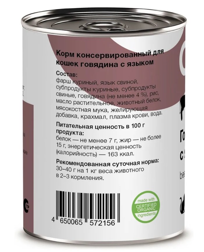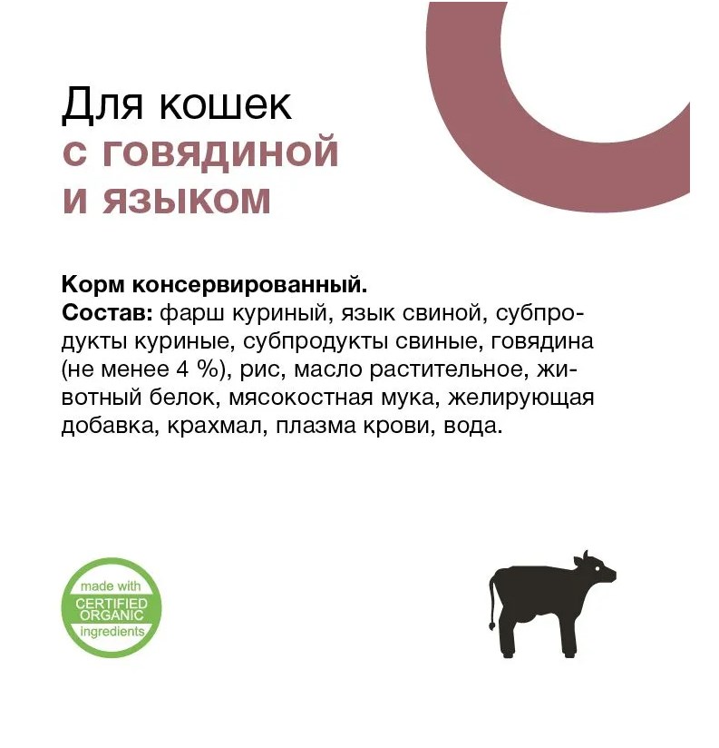 Нежное питание, в составе которого только натуральные продукты. Оно безусловно порадует вашу кошку аппетитным сочетанием свежего мяса говядины и языка.