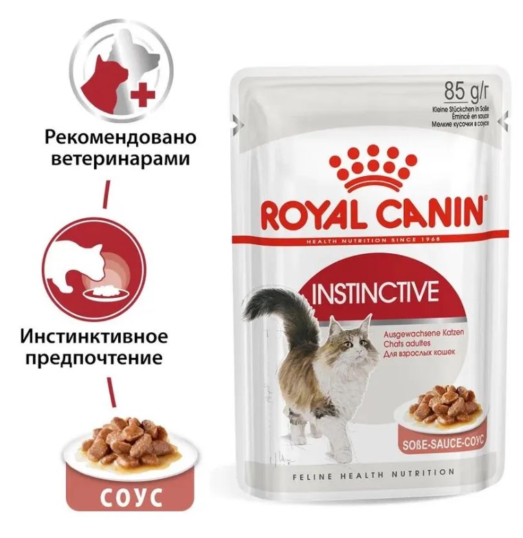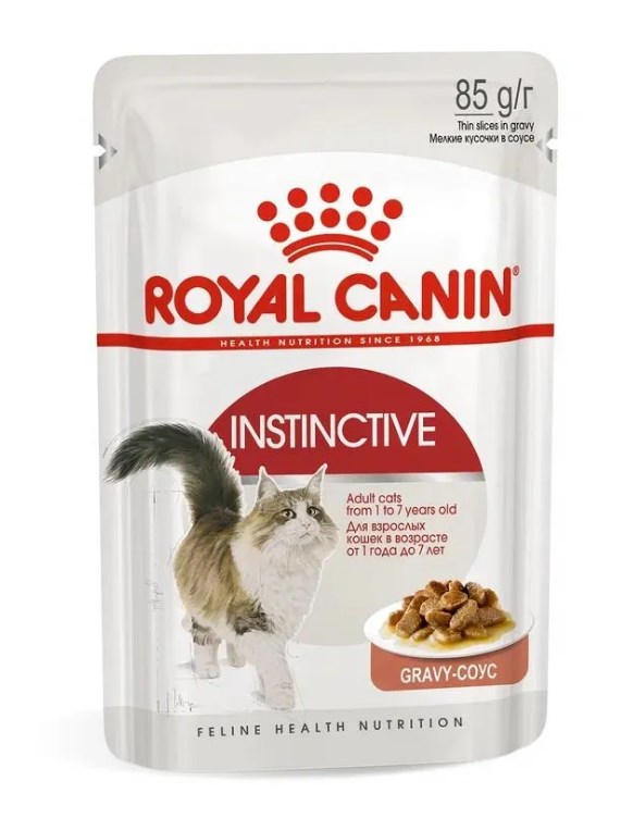 Формула влажного продукта ROYAL CANIN® Instinctive (ИНСТИНКТИВ), мелкие кусочки в соусе исключительной аппетитности, поддерживает оптимальный вес, способствует поддержанию здоровья мочевыделительной системы, а также соответствует инстинктивным предпочтениям кошки.