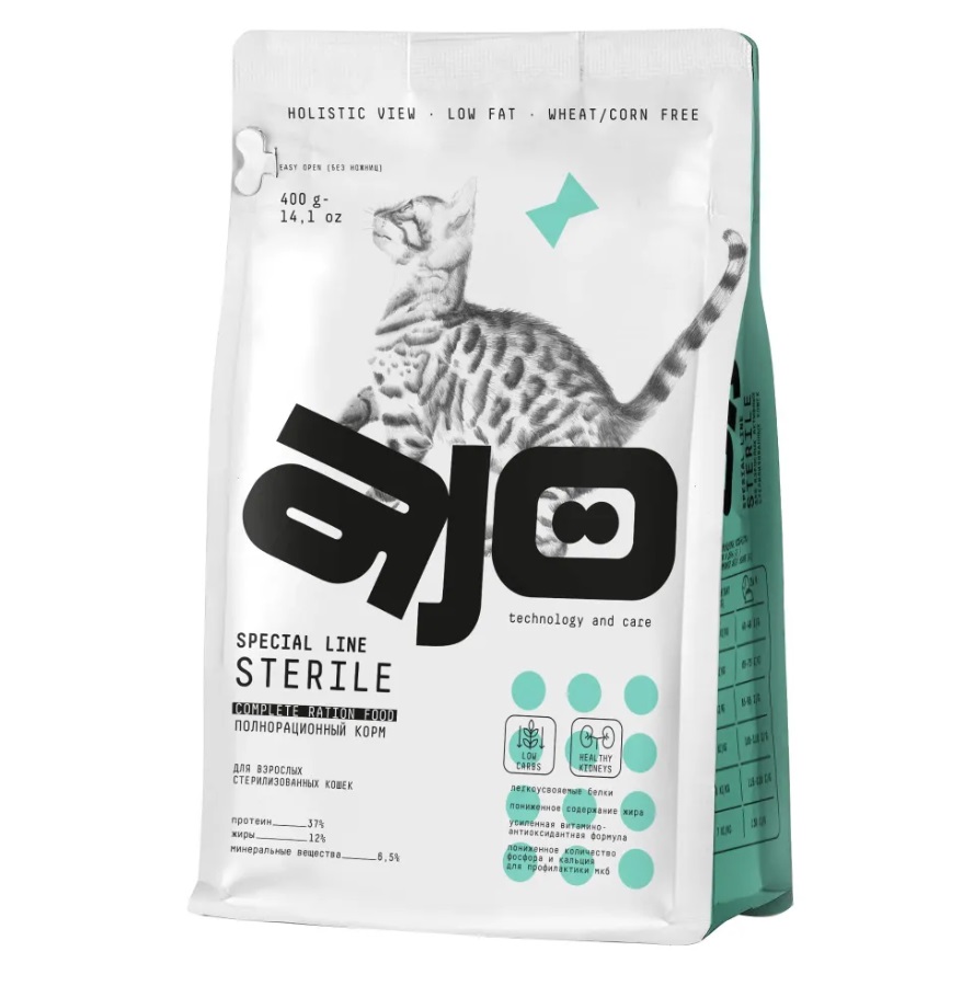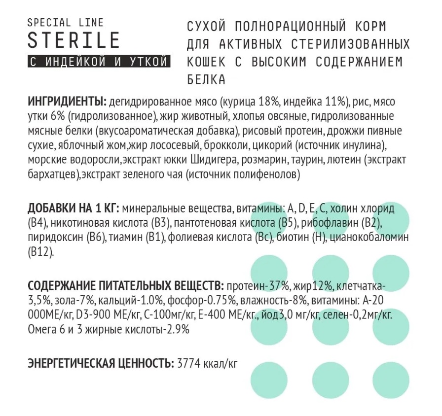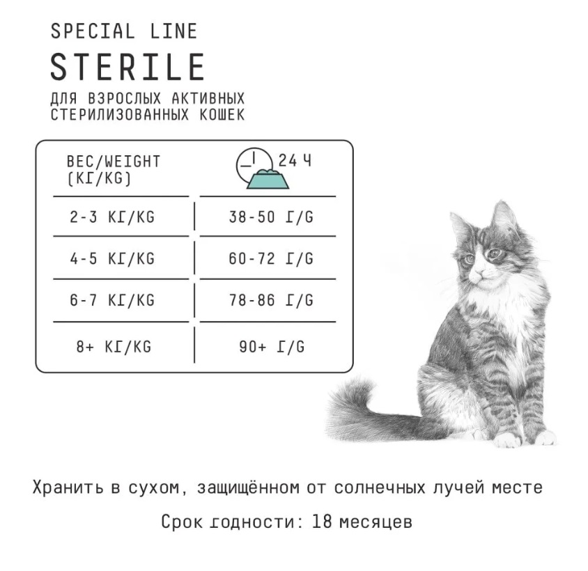 Сухой полнорационный корм для активных стерилизованных кошек с высоким содержанием белка.