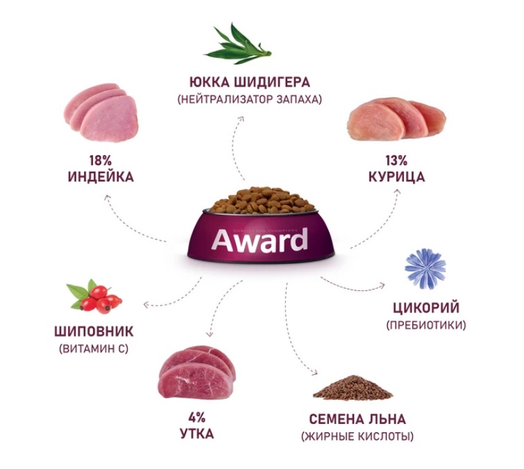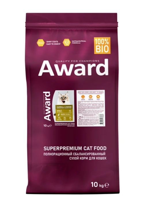Сухой корм AWARD Hairball & Indoor для взрослых кошек для выведения шерсти с уткой и индейкой с добавлением зеленой чечевицы и Юкки Шидигера 10 кг.
