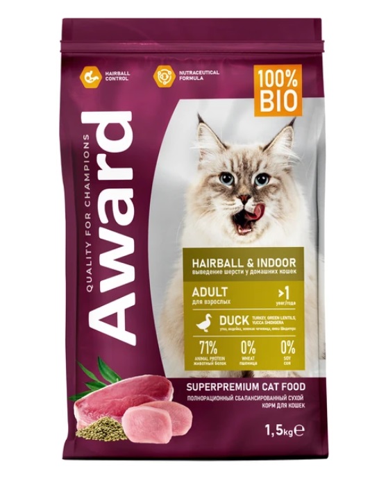 Сухой корм AWARD Hairball & Indoor для взрослых кошек для выведения шерсти с уткой и индейкой с добавлением зеленой чечевицы и Юкки Шидигера 1,5 кг.