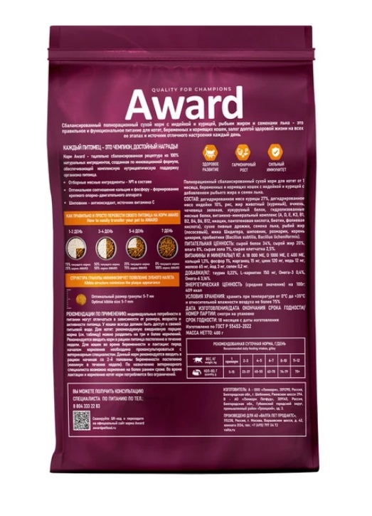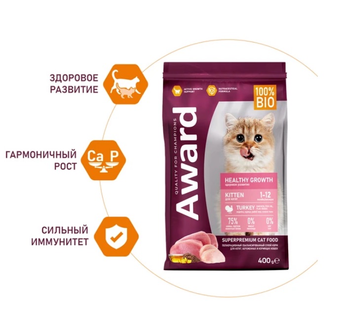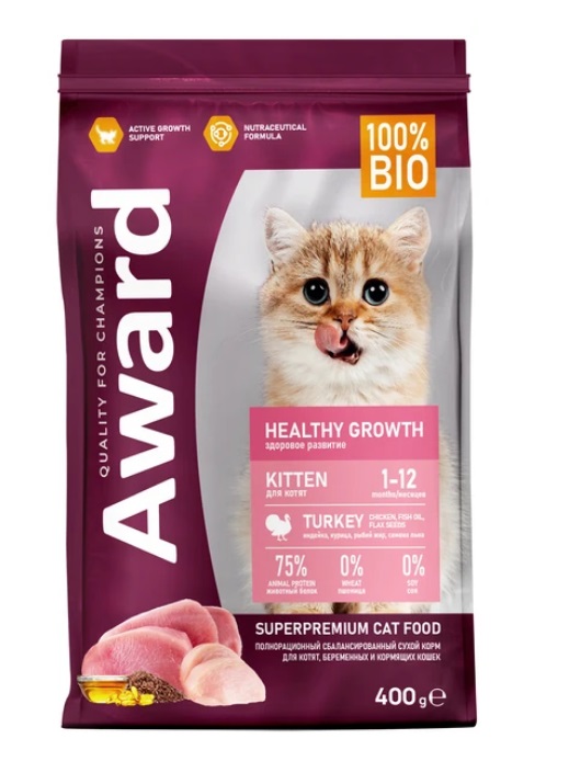 AWARD Корм Healthy growth д/котят от 1месяца,беременных и кормящих кошек с индейкой и курицей 400г.