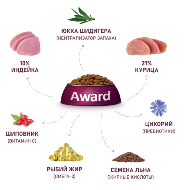Состав: дегидрированное мясо курицы 27%, дегидрированное мясо индейки 10%, рис, жир животный (куриный), ячмень, чечевица зеленая, кукурузный белок, гидролизованные мясные белки, витаминно-минеральный комплекс (А, D, E, K3, B1, B2, B4, B6, B12, ниацин, пантотеновая кислота, биотин, фолиевая кислота), сухие пивные дрожжи, семена льна, рыбий жир (лососевый), юкка Шидигера, шиповник, розмарин, корень цикория, пробиотики (Bacillus subtilis, Bacillus licheniformis).