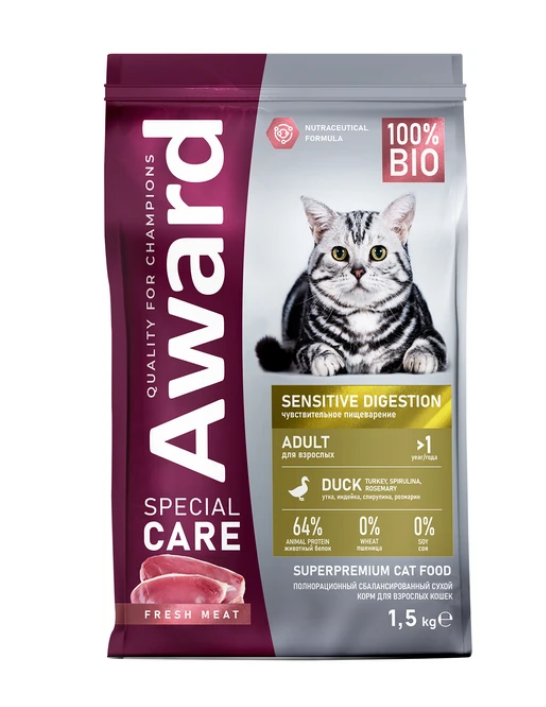 Корм Award - тщательно сбалансированная рецептура из 100% натуральных ингредиентов, созданная по инновационной формуле, обеспечивающей комплексную нутрицевтическую поддержку организма питомца.