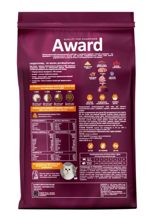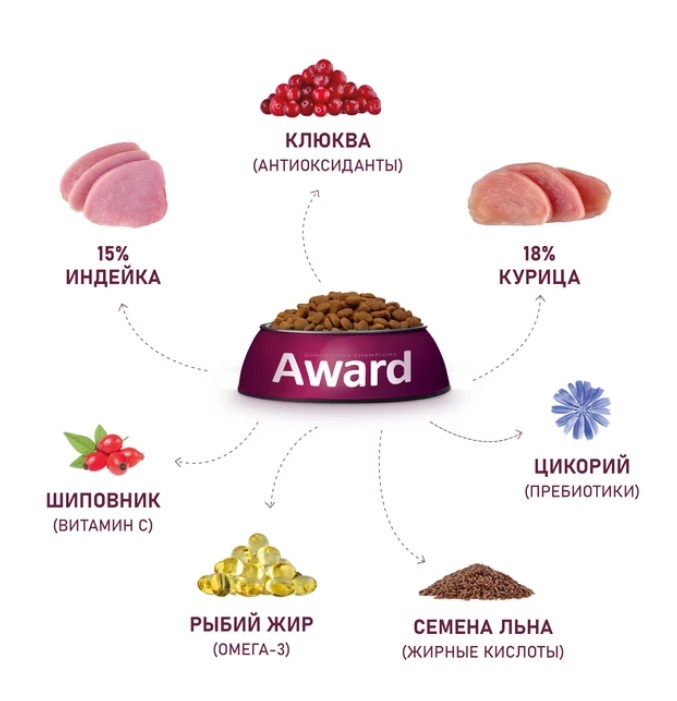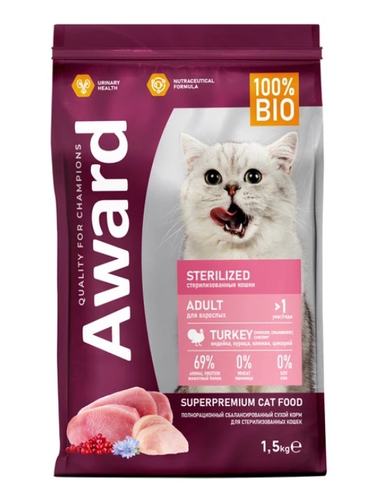 Сухой корм AWARD Sterilized для взрослых стерилизованных кошек с индейкой и курицей с добавлением клюквы и цикория 1,5 кг.