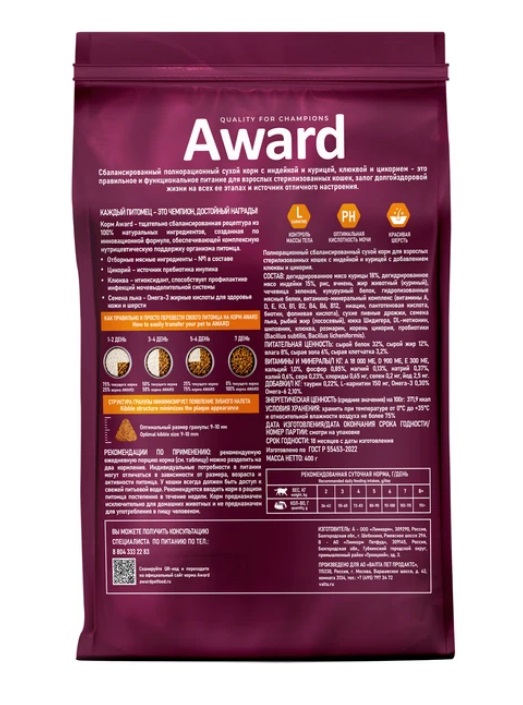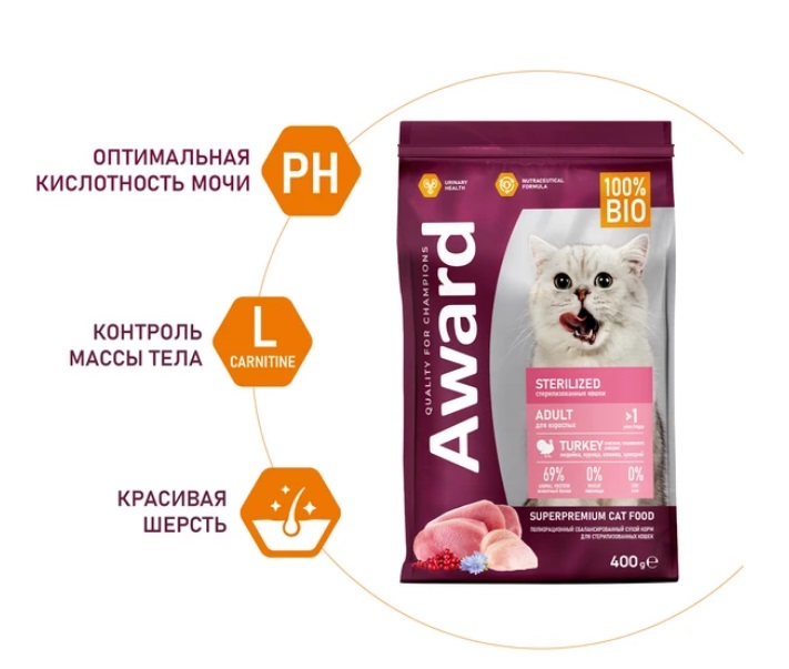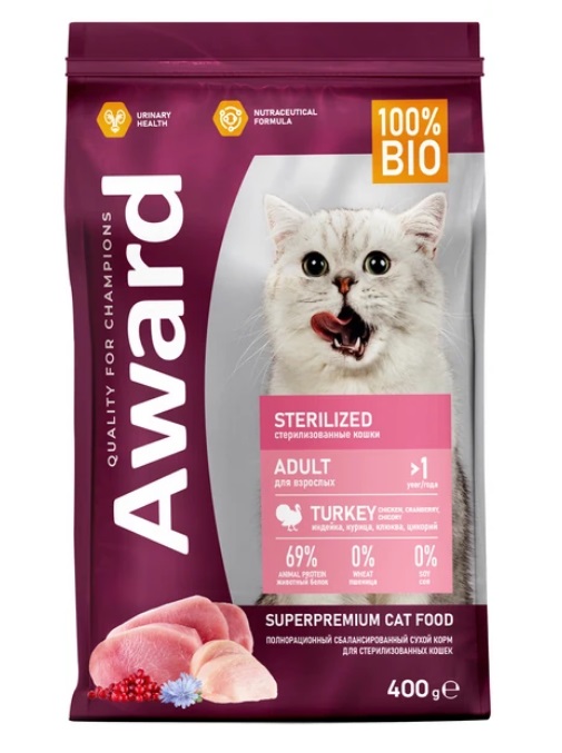 AWARD Sterilized корм для стерил.кошек с индейкой и курицей с добавлением клюквы и цикор.400г.