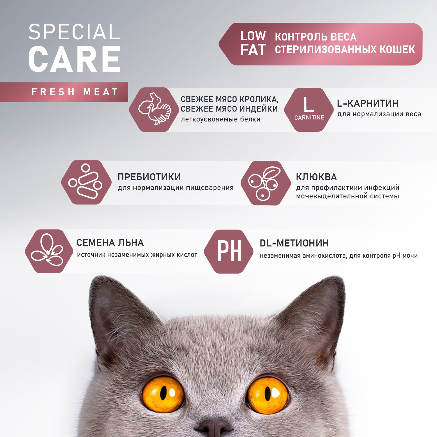 ✅ Рацион со сниженным содержанием жира и пониженной калорийность для кошек с избыточной массой тела и склонных к набору лишнего веса.