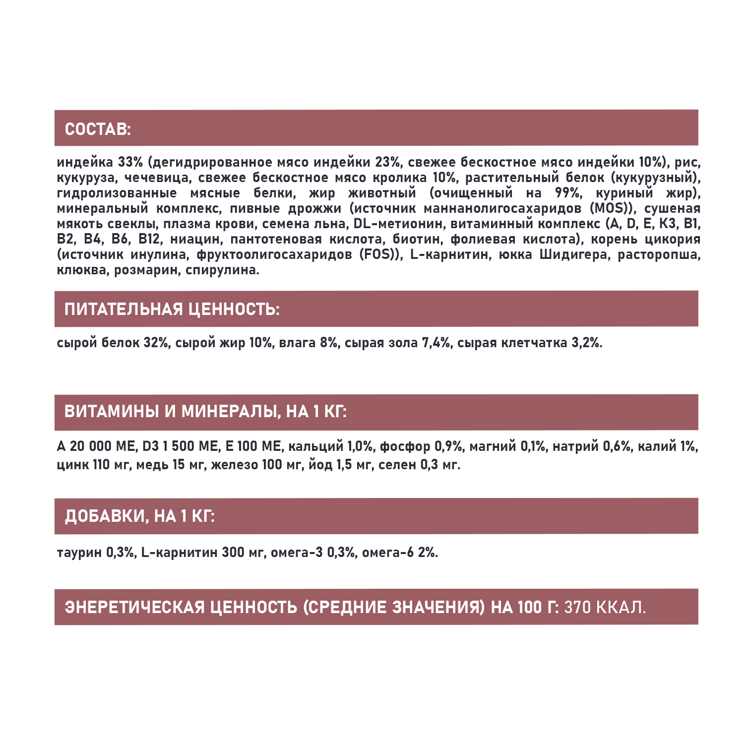 СОСТАВ: индейка 33% (дегидрированное мясо индейки 23%, свежее бескостное мясо индейки 10%), рис, кукуруза, чечевица, свежее бескостное мясо кролика 10%, растительный белок (кукурузный), гидролизованные мясные белки, жир животный (очищенный на 99%, куриный жир), минеральный комплекс, пивные дрожжи (источник маннанолигосахаридов (MOS)), сушеная мякоть свеклы, плазма крови, семена льна, DL-метионин, витаминный комплекс (А, D, E, К3, В1, В2, В4, В6, В12, ниацин, пантотеновая кислота, биотин, фолиевая кислота), корень цикория (источник инулина, фруктоолигосахаридов (FOS)), L-карнитин, юкка Шидигера, расторопша, клюква, розмарин, спирулина.