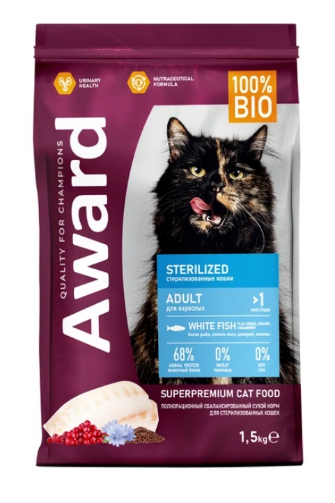 Сухой корм AWARD Sterilized для взрослых стерилизованных кошек с белой рыбой с добавлением семян льна, клюквы и цикория 1,5 кг.