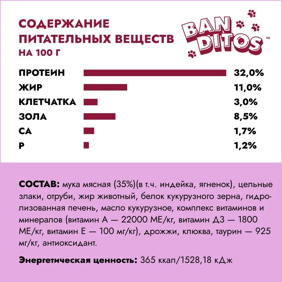 Состав: Мука мясная (35%)(в т.ч. индейка, ягненок), цельные злаки, отруби, жир животный, белок кукурузного зерна, гидролизованная печень, масло кукурузное, комплекс витаминов и минералов, дрожжи, клюква, таурин, антиоксидант.