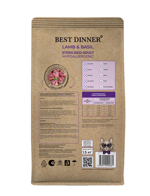 Высококачественный низкозерновой рацион для кошек Best Dinner с ягненком и базиликом не оставит равнодушным ни одного пушистого гурмана. Гранулы в форме сердечек не оставят равнодушными даже самых привередливых кошек.