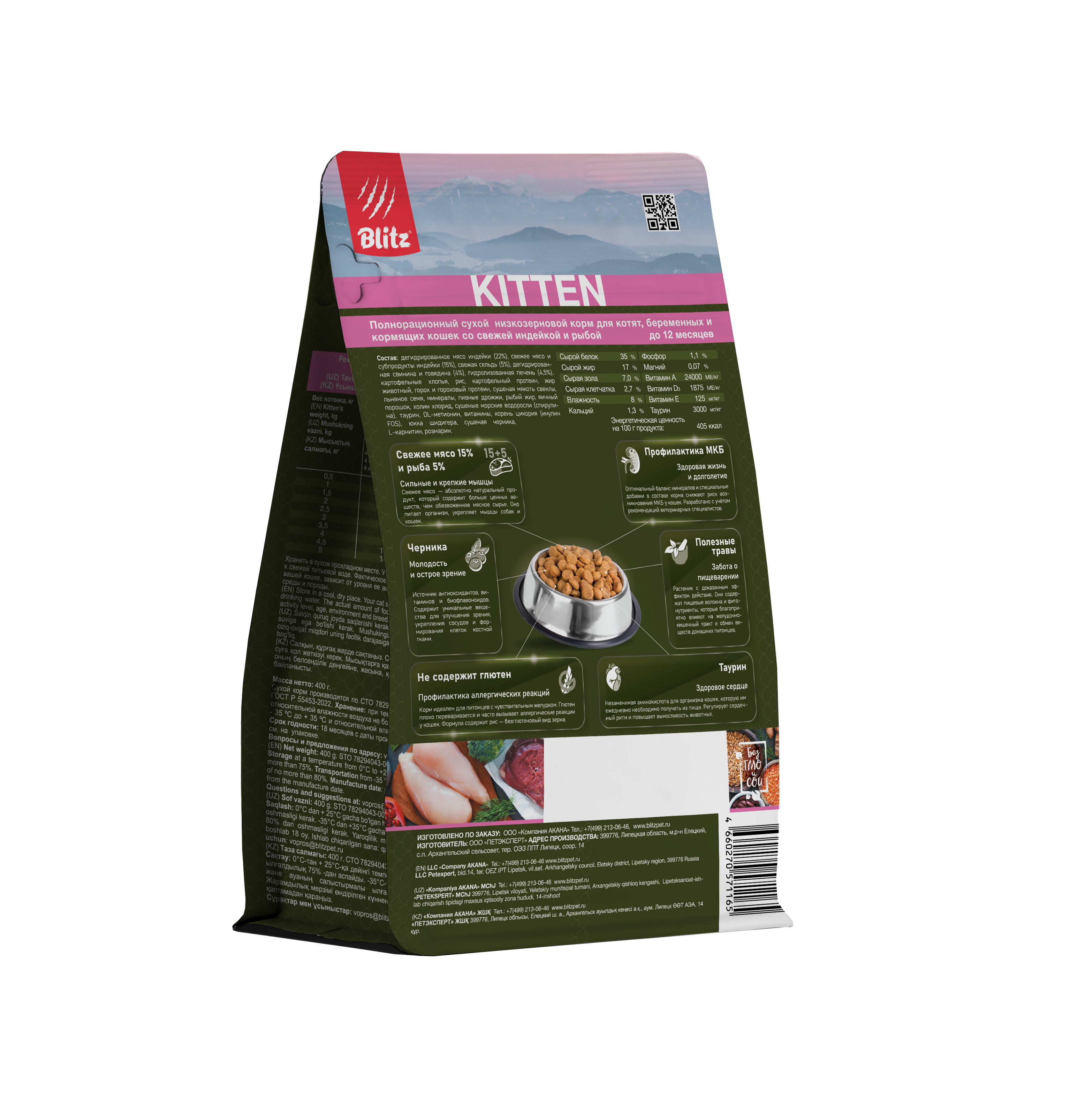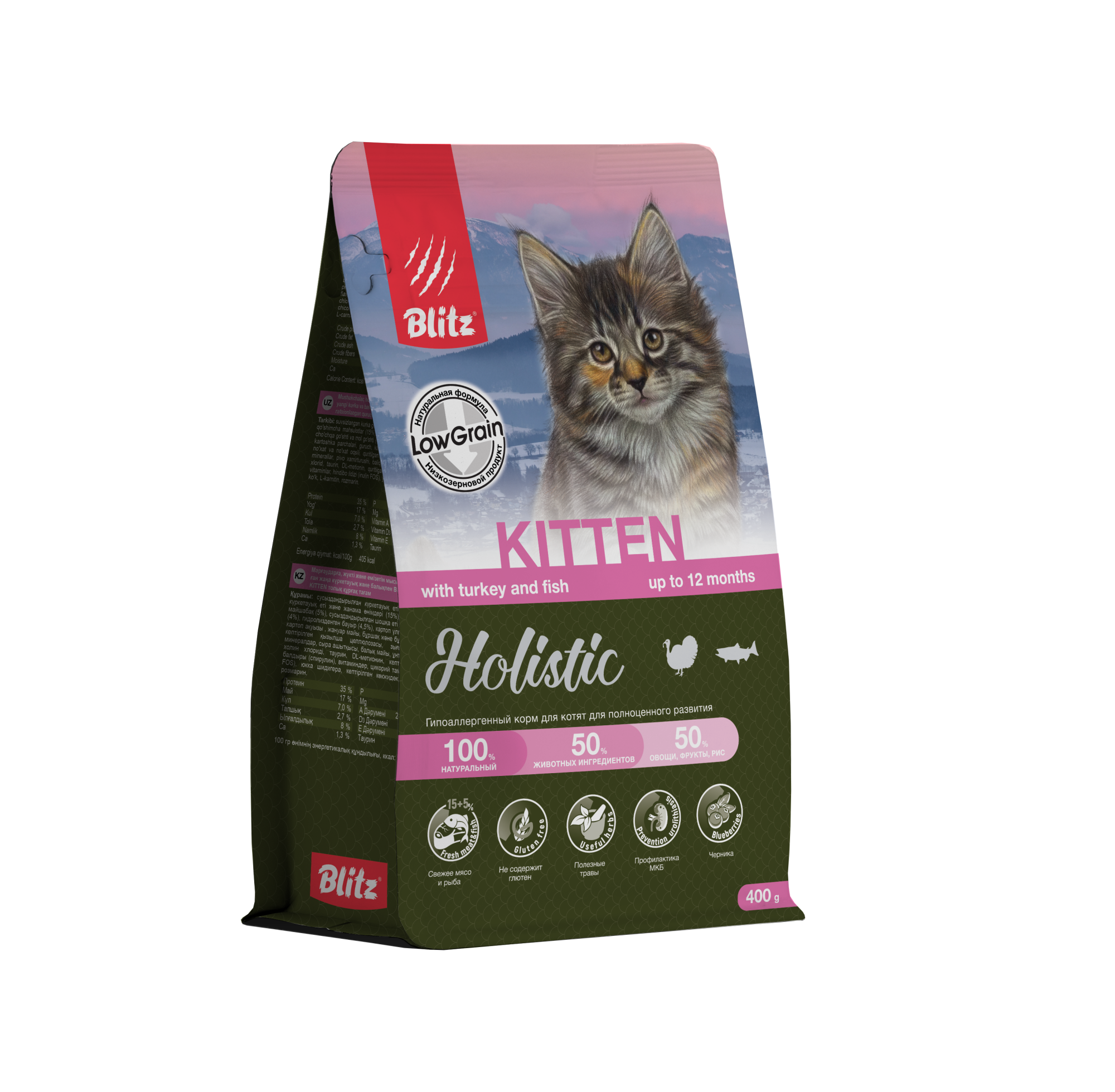 Низкозерновой сухой корм Blitz Holistic Turkey & Fish Kitten разработан для кормления котят с одного месяца и до года.