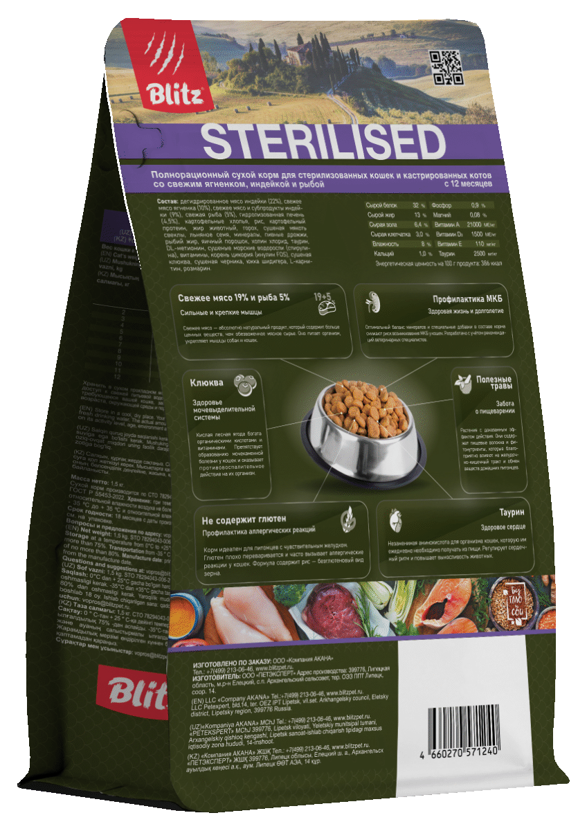 Полнорационный сухой корм Blitz Holistic Lamb and Fish Sterilised Cat предназначен для регулярного кормления стерилизованных кошек или кастрированных котов. В основе рациона — несколько видов мяса и рыба, при этом большая часть сырья добавлена не в сушёном, а свежем виде. Такой подход позволяет максимально сохранить полезные вещества и создать неповторимый, богатый вкус готового продукта.