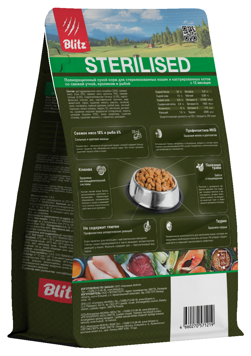 Низкозерновой корм Blitz Holistic Cat Duck & Rabbit Sterilised Cat сочетает сразу четыре любимых кошками продукта: индюшку, утку, кролика и морскую рыбу — сельдь!