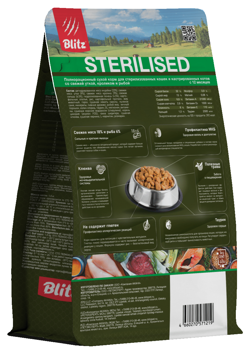 Низкозерновой корм Blitz Holistic Cat Duck & Rabbit Sterilised Cat сочетает сразу четыре любимых кошками продукта: индюшку, утку, кролика и морскую рыбу — сельдь! Примечательно, что большая часть мясных компонентов добавлена в корм Blitz Holistic в свежем, а не в дегидрированном виде. А зерна в этой формуле — совсем мало.