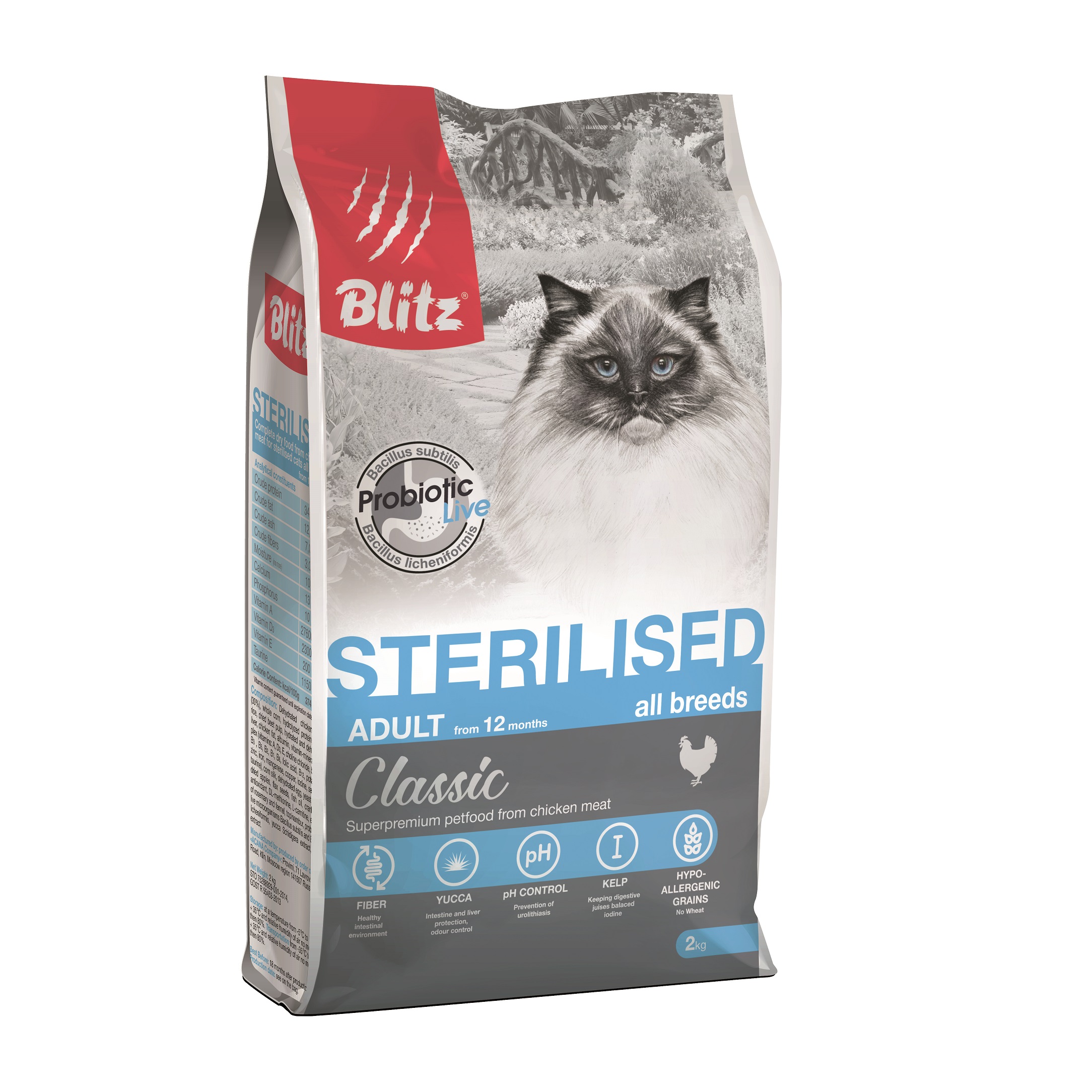 Blitz Sterilised Cats Chicken — это полнорационный сухой корм класса суперпремиум, разработанный с учётом потребностей стерилизованных кошек и кастрированных котов.