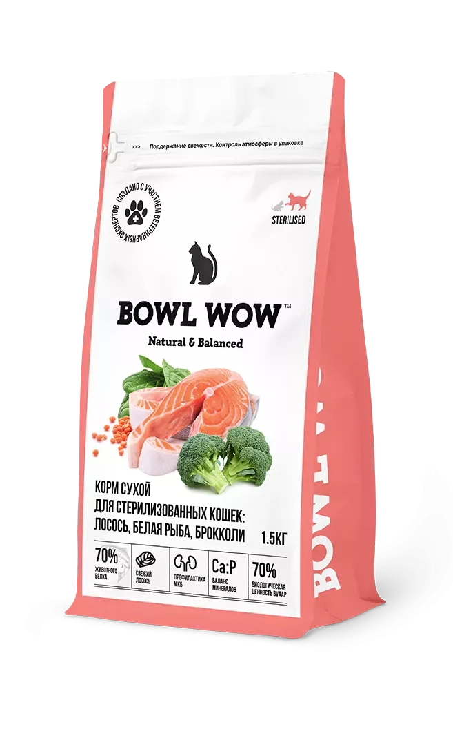 Полнорационный корм BOWL WOW с лососем, белой рыбой океанических пород и добавлением брокколи — это тщательно сбалансированная формула со свежим сочным лососем первого сорта и оптимальным энергетическим профилем.Свежие рыбные ингредиенты делают корм более вкусным и привлекательным для питомцев. Для поддержки здоровья стерилизованных животных мы разработали уникальный комплекс Eo Sterilised, который включает в себя клюкву, бруснику, DL-метионин, L-карнитин и растительную клетчатку. Комплекс нацелен на профилактику образования камней в мочевыводящих путях, правильное функционирование желудочно-кишечного тракта и поддержку здорового веса стерилизованного любимца. Размер гранул 8 мм идеально подходит для взрослых кошек.