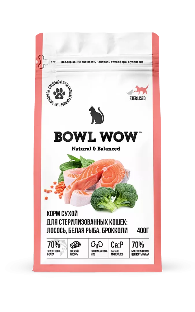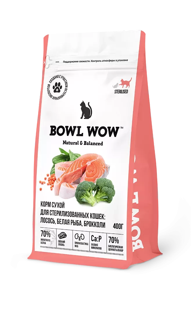 Полнорационный корм BOWL WOW с лососем, белой рыбой океанических пород и добавлением брокколи — это тщательно сбалансированная формула со свежим сочным лососем первого сорта и оптимальным энергетическим профилем.Свежие рыбные ингредиенты делают корм более вкусным и привлекательным для питомцев. Для поддержки здоровья стерилизованных животных мы разработали уникальный комплекс Eo Sterilised, который включает в себя клюкву, бруснику, DL-метионин, L-карнитин и растительную клетчатку. Комплекс нацелен на профилактику образования камней в мочевыводящих путях, правильное функционирование желудочно-кишечного тракта и поддержку здорового веса стерилизованного любимца. Размер гранул 8 мм идеально подходит для взрослых кошек.