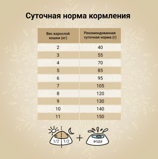 Состав: сырая курица (20%), гороховый крахмал, дегидратированный куриный белок (10%), дегидратированный белок сельди (10%), сельдь (8%), лосось (8%), куриный жир, рыбий жир (лососевый), экстрактированные семена киноа (4%), гидролизованный рыбий белок (треска, пикша), гидролизованные белки птицы (курица, индейка), куриные потроха (печень, сердце, почки), сухое яйцо (куриное), льняное семя, сухая свекольная пульпа, люцерновая мука, волокна гороха, сушеная черника (0,5%), сушеная клюква, сушеная ацерола, сушеное яблоко Аннурка, сушеная спаржа, сушеная тыква, инулин цикория (0,4%), дрожжевой экстракт (источник маннанолигосахаридов) (0,3%), фруктоолигосахариды (0,3%), аскофиллум узловатый (Ascophyllum Nodosum), карбонат кальция, монокальцийфосфат, хлорид калия, хлорид натрия, сухие пивные дрожжи, алоэ вера, розмарин, куркума, календула, шелуха и семена подорожника, юкка Шидигера.