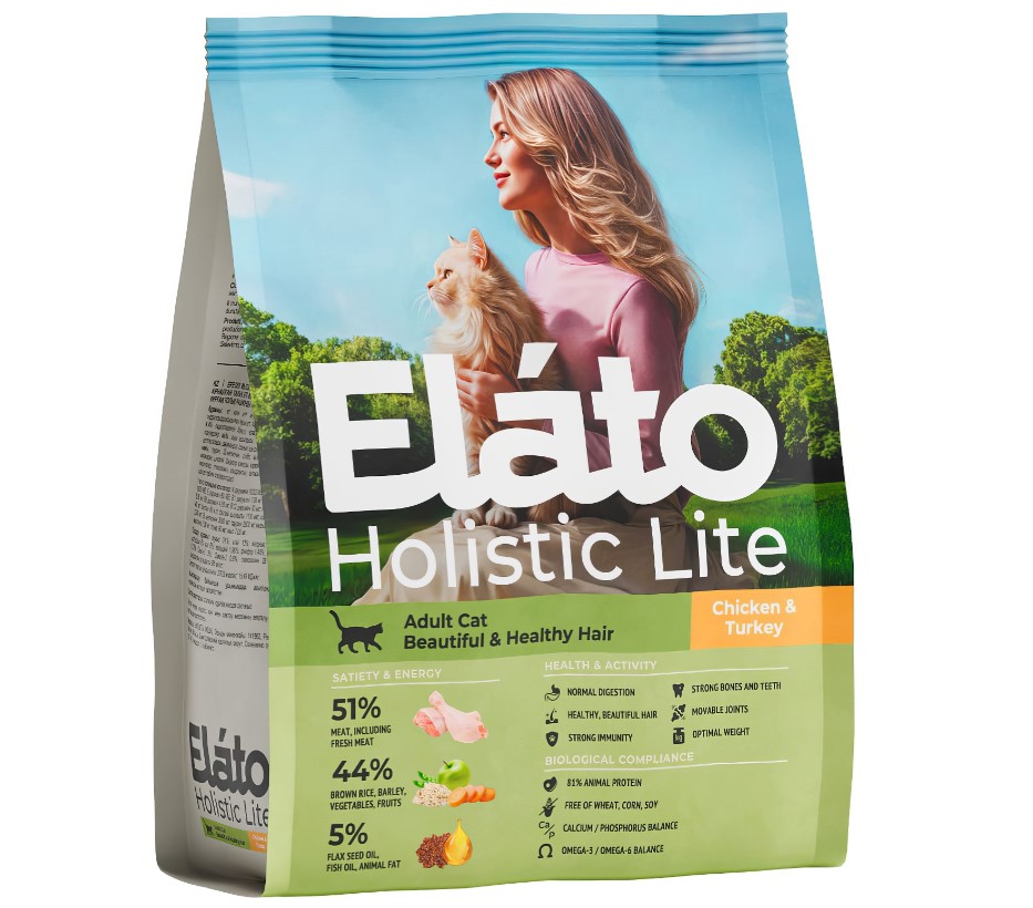 Elato Holistic Lite – полнорационный сухой корм для взрослых кошек для красивой и здоровой шерсти, разработанный по принципам правильного питания.