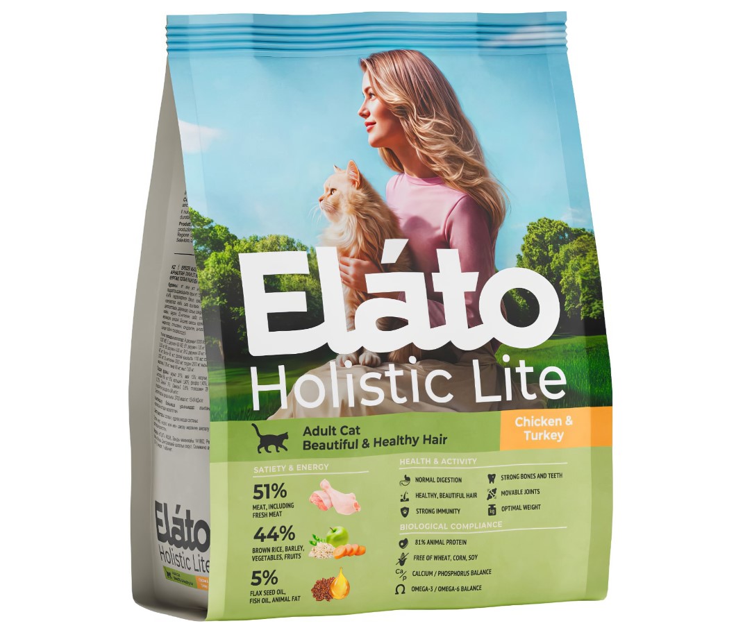 Elato Holistic Lite – полнорационный сухой корм для взрослых кошек для красивой и здоровой шерсти, разработанный по принципам правильного питания.
