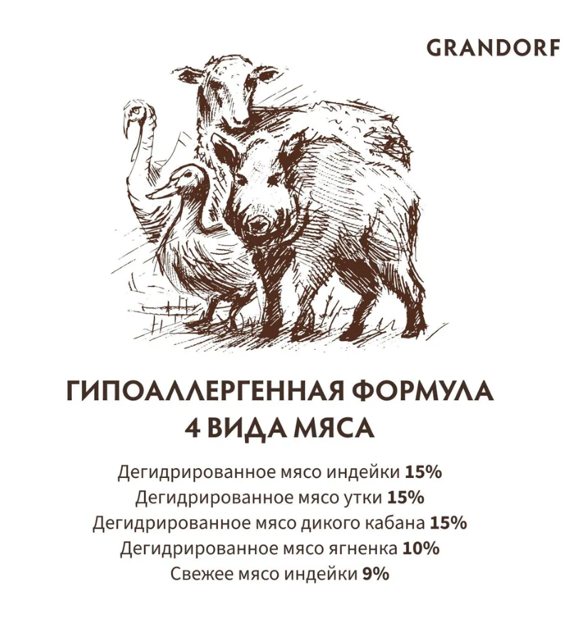 Состав: Дегидрированное мясо индейки (17%), Дегидрированное мясо утки (16%), Дегидрированное мясо дикого кабана (15%), Цельнозерновой коричневый рис, Сушеный батат, Дегидрированное мясо ягненка (10%), Свежее мясо индейки (8%), Жир индейки (2%), Мука из плода рожкового дерева, Порошок корней цикория (натуральный источник пребиотиков: FOS и инулин), Растительная клетчатка, Пивные дрожжи (природный источник MOS и бета-глюканов), Свежее масло лосося (1%), Сушеный антарктический криль (натуральный источник ЭПК и ДГК, 1%), Сушеное яблоко, Сушеная клюква, юкка Мохаве.