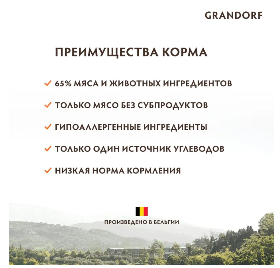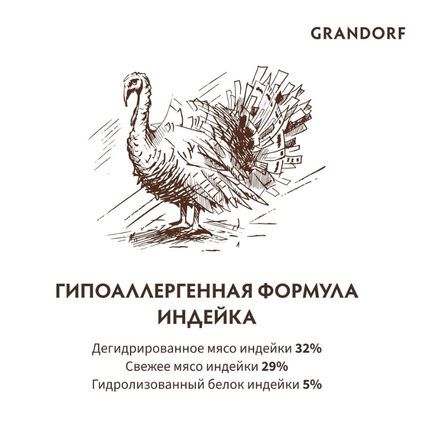 Дегидрированное мясо индейки (32%), Свежее мясо индейки (29%), Цельнозерновой коричневый рис, Гидролизованный белок индейки (5%), Жир индейки (3%), Свежее масло лосося (1%), Льняное семя, Порошок корней цикория (натуральный источник пребиотиков: FOS и инулин), Пивные дрожжи (природный источник MOS и бета-глюканов), Сушеное яблоко, Сушеный шпинат, Сушеная брокколи, Сушеная клюква, Сушеная черника, Растительная клетчатка, юкка Мохаве.