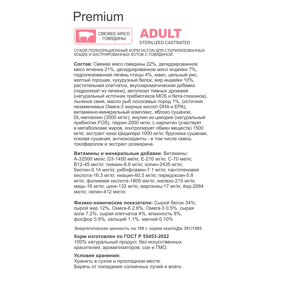 Сухой корм HILTON для стерилизованных кошек и кастрированных котов с говядиной.