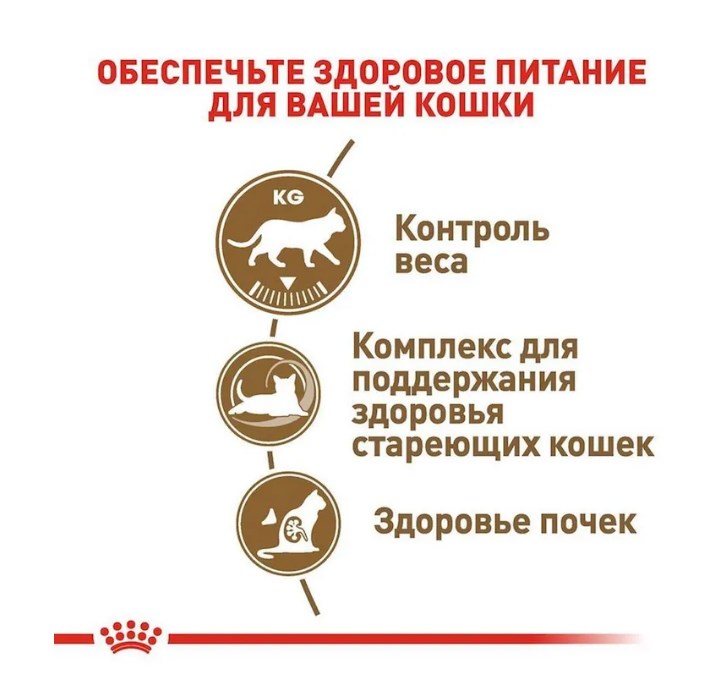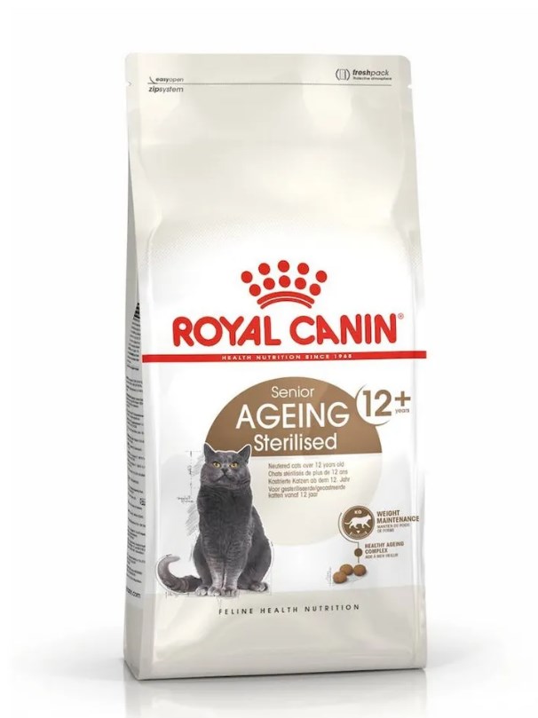 Формула сухого продукта ROYAL CANIN® Ageing Sterilised 12+ (ЭЙДЖИНГ СТЕРИЛАЙЗД 12+) поддерживает оптимальный вес, здоровье почек и мочевыделительной системы, а также способствует поддержанию здоровья стареющих кошек.