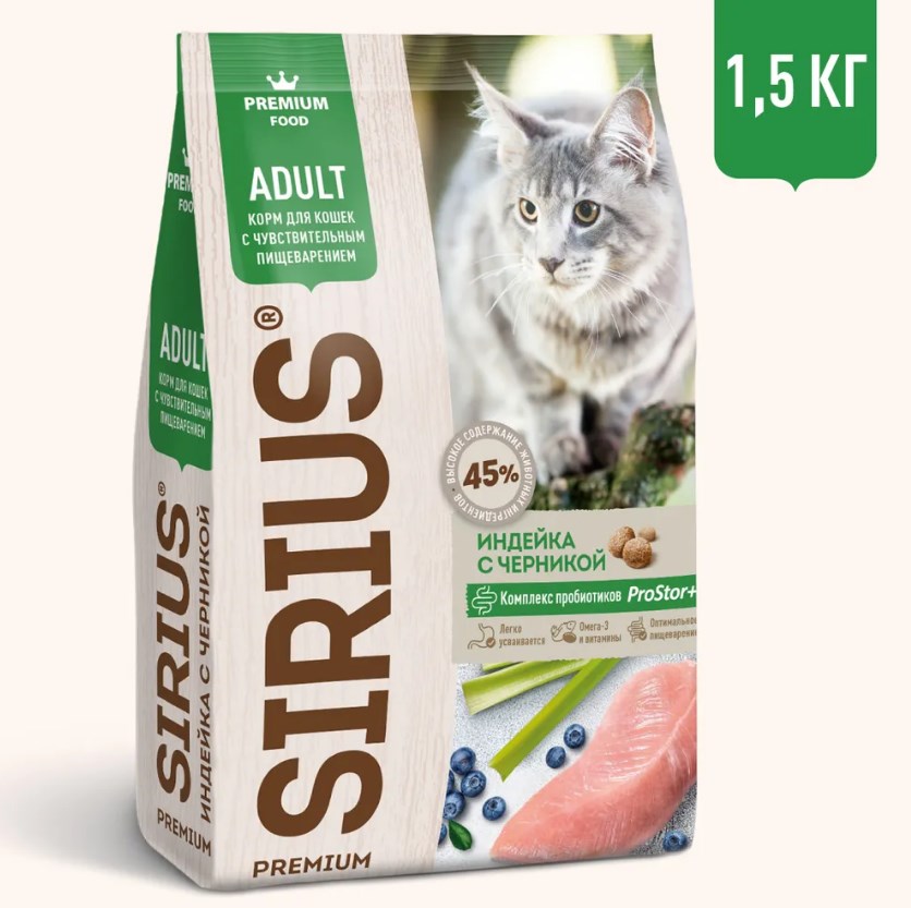 SIRIUS — сухой корм премиум-класса для полноценного ежедневного питания взрослых кошек с чувствительным пищеварением. Высокое содержание мясных ингредиентов обеспечивает оптимальный уровень белка и укрепляет мышцы. Пониженное содержание жиров для контроля веса. Баланс витаминов и комплекса пробиотиков 4-го поколения PROSTOR+ нормализует пищеварение и укрепляет иммунитет. Омега 3 и Омега 6 способствуют поддержанию здоровья сердца, мозга, нервной системы, здоровья кожи и красоты шерсти. Черника обладает бактерицидными свойствами и способствует обновлению клеток.