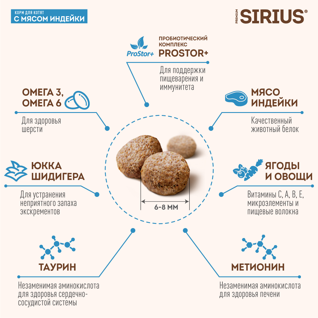 SIRIUS — сухой корм премиум-класса для полноценного ежедневного рациона котят с 1-2-х месяцев до 1 года. Высокое содержание мясных ингредиентов обеспечивает оптимальный уровень белка и укрепляет мышцы. Баланс витаминов и комплекса пробиотиков 4-го поколения PROSTOR+ нормализует пищеварение и укрепляет иммунитет. Омега 3 и Омега 6 способствуют поддержанию здоровья сердца, мозга, нервной системы, здоровья кожи и красоты шерсти. Специально подобранный размер гранулы для котят.